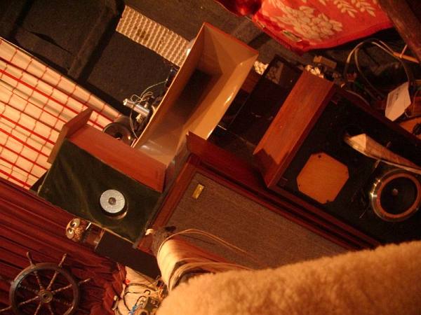 バラバラに置いた9個のスピーカーから鳴っているとは思えない妙な統一感のある感じでした。特殊な未知のサラウンドシステムのような感じさえします。不思議です。このガチャガチャな部屋の雰囲気とは異なり、中域音が驚くほど綺麗でした。JBLの巨大なホーンがとても上手く鳴っているのかも知れません。