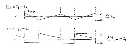 電流と時間の積(面積)つまり電荷から、コイル電流ILと入力電流IBと出力電流Ioの関係を考察しておく。